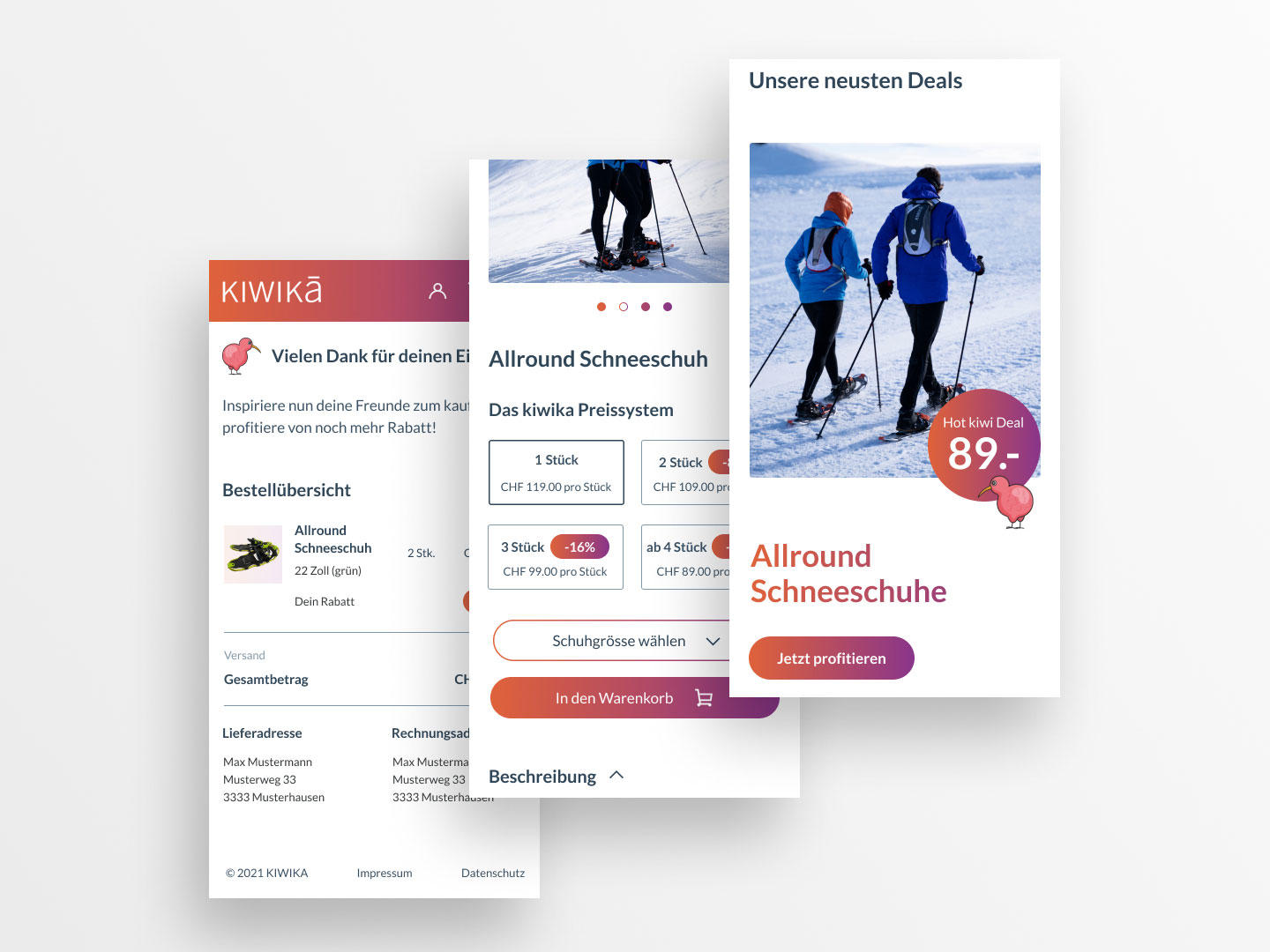 Der frisch lancierte Onlineshop von kiwika verzeichnete zwar etliche Aufrufe, Bestellungen wurden aber kaum getätigt. Um dieses Problem zu lösen, sollten wir die Usability und User Experience des Shops mit besonderem Augenmerk auf den Bestellprozess optimieren. Gleichzeitig schlugen wir vor, auch das Design des Onlineshops zu überarbeiten, um mehr Vertrauen zu schaffen und das Prinzip mit den Mengenrabatten verständlicher zu machen.