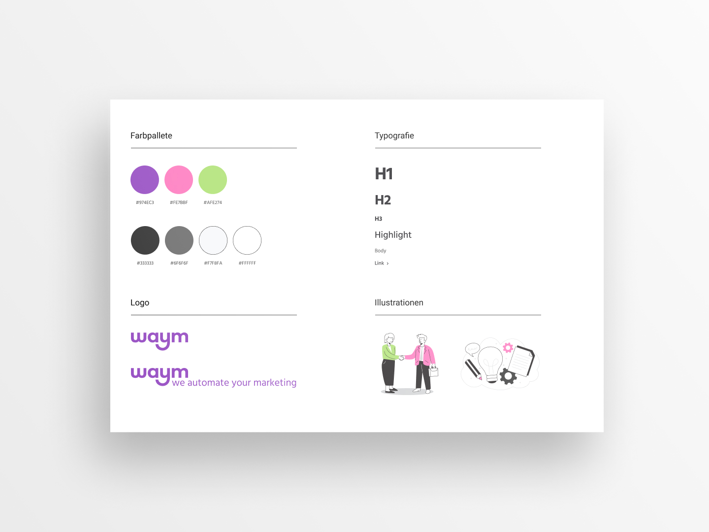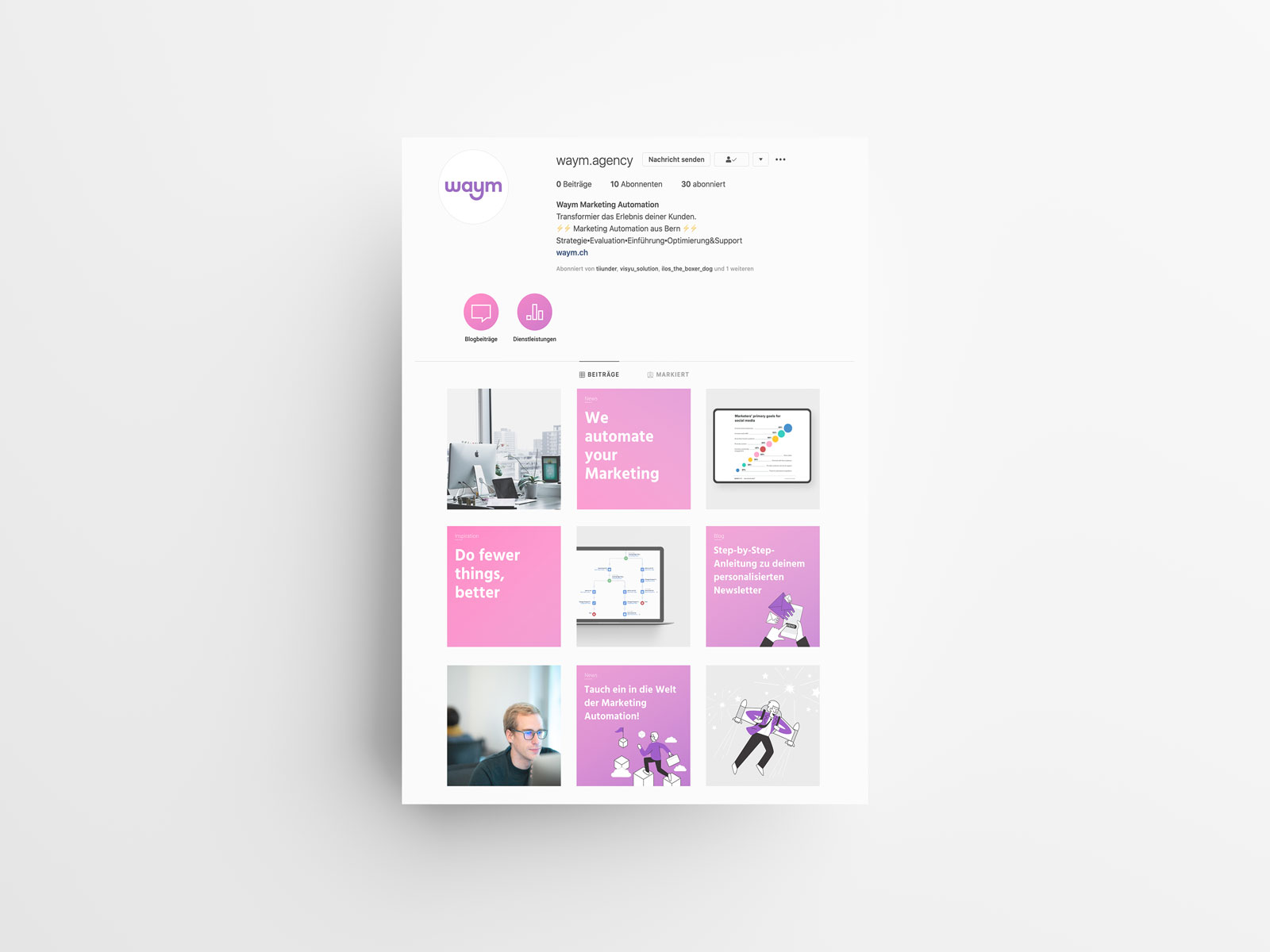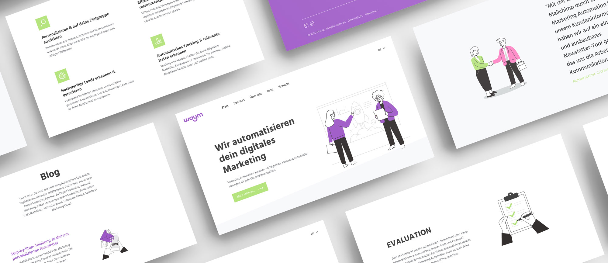 Seit einigen Jahren bieten Artd Webdesign auch Marketing Automatisierungslösungen an. Damit dieser Marktzweig besser beworben werden konnte, gründeten wir die Tochterfirma Waym Marketing Automation. Das gesamte Team von Artd half mit, den neuen Brand aus dem Boden zu stampfen und eine authentische und einzigartige Markensprache zu entwickeln.